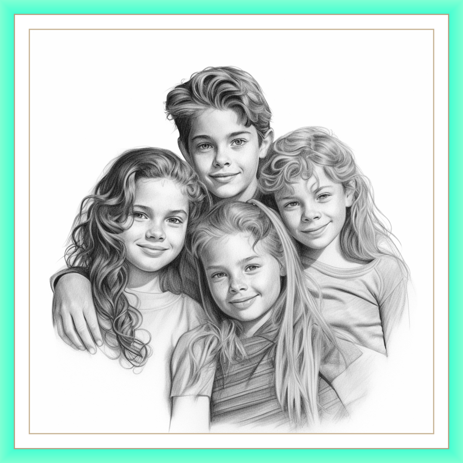 Ofereça à sua família uma Prenda única e inesquecível com este retrato a carvão ou lápis que irá destacar a conexão e as emoções partilhadas entre os seus entes queridos.